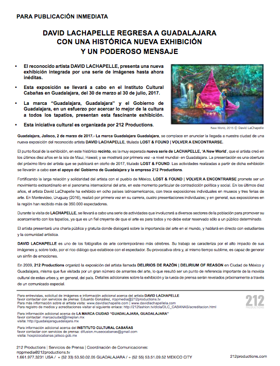 Para entrevistas, solicitud de imágenes e información adicional acerca del artista DAVID LACHAPELLEfavor contactar con servicios de prensa.Para más información sobre el artista visita: www.davidlachapelle.com